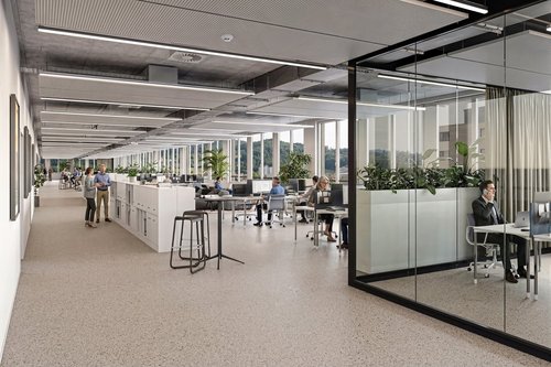 Hinweis: Die gezeigten Bilder sind Visualisierungen des Neubaus H² sowie Beispielaufnahmen aus dem benachbarten Haus der Wirtschaft als Inspiration für mögliche Ausbauvarianten sowie Darstellung dessen Services zur Mitbenutzung.