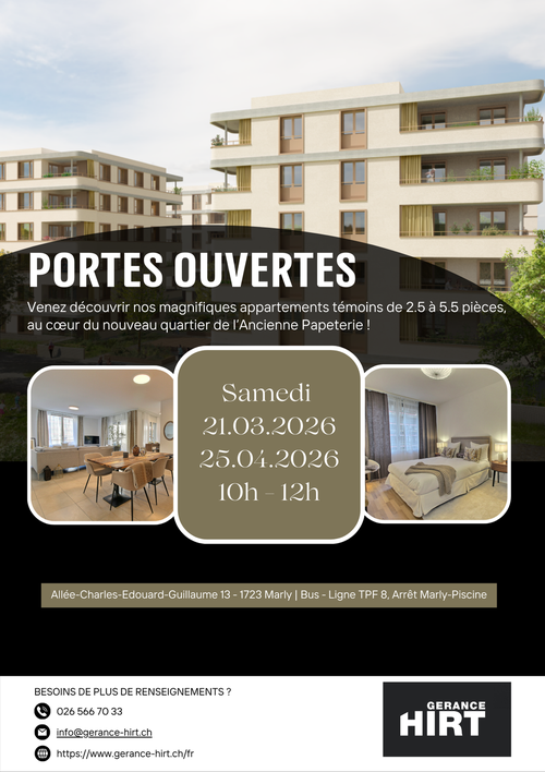 Situés au cœur du nouvel écoquartier à Marly, ces appartements modernes allient confort, qualité et cadre de vie agréable. Vous profitez d’une proximité idéale avec les commerces, restaurants, écoles, crèche, piscine et arrêts de bus (ligne 8 avec cadence toutes les 15 minutes vers Fribourg et Corminboeuf). Agencement : • Hall d’entrée avec armoire murale • Cuisine droite entièrement équipée et semi ouverte • 1 balcon • Spacieux et lumineux séjour • 3 chambres • 1 salle de bain avec colonne de lavage • 1 salle de douche • Cave avec prise