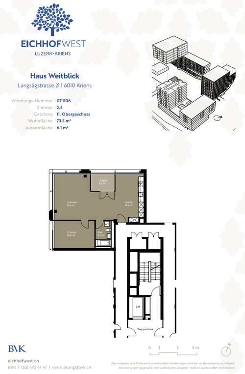 Per August 2026 vermieten wir diese modernen 1½- bis 6½-Zimmer-Wohnungen im Haus «Weitblick», dem Wahrzeichen vom neuen Eichhof West in Kriens. Am Rande von Luzern entstehen im Eichhof West 234 Mietwohnungen in verschiedensten Grössen und Konfigurationen. Egal ob allein, in Partnerschaft, mit Familie oder wenn die Kinder ausgezogen sind – das Eichhof West ist ein Quartier für jede Lebensphase. Ein Ort, an welchem man gerne Wurzeln schlägt. Auf folgende Annehmlichkeiten können Sie sich im Haus «Weitblick» freuen: – Nachhaltigkeit in der Erstellung sowie auch im Betrieb – Attraktiver Eichenparkett – Bodenheizung mit Geo-Cooling – Küchen mit eleganter Materialisierung – Waschmaschine/Tumbler in der Wohnung – Personenaufzug rollstuhlgängig – Teilweise Aussicht auf die Berge – Teilweise Seesicht ab dem 10. OG Die attraktive Umgebung: – Parkähnlicher, autofreier Aussenraum – Gemeinschaftsterrasse und -Raum im Haus «Querbeet» – Lebensmittelgeschäft im 1. UG des Hauses «Weitblick» Eichhof West – Stadt Luzern und Naherholungsgebiete in wenigen Minuten erreichbar – Autobahn- und ÖV-Anschluss direkt vor der Tür Aufgrund des Baustellenbetriebs sind keine Besichtigungen möglich. Die Vermietung erfolgt «ab Plan». Auf der Projektwebsite www.eichhofwest.ch haben Sie die Möglichkeit, visualisierte Musterwohnungen und die Aussichten ab dem 10. OG virtuell zu besichtigen. Ausserdem finden Sie zusätzliche Informationen zur Überbauung und können sich weitere verfügbare Wohnungen ansehen und sich für diese anmelden. Wir freuen uns auf Ihre Kontaktaufnahme! BVK - Die Pensionskasse mit attraktivem Wohnraum in der ganzen Schweiz. Tagesaktuell auf www.bvk.ch.
