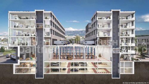 RUBIX une opportunité UNIQUE de réunir sa logistique et ses locaux artisanaux (ateliers, laboratoires, bureaux) sous un même toit à Genève. Rubix propose des surfaces high-tech et modulables qui peuvent être aménagées sur-mesure selon votre domaine d’activité au cœur de la zone industrielle de Meyrin Satigny (ZIMEYSA), à proximité de l’aéroport de Genève: • Composé de deux bâtiments qui totalisent plus de 47’000 m² de surfaces à louer dès 500 m². • RUBIX est adapté aux besoins des entreprises. Sa dimension futuriste ainsi que son approche entièrement personnalisée en font la destination idéale pour des sociétés aux exigences élevées, actives par exemple dans les hautes technologies, la recherche et le développement, les domaines pharmaceutiques et médicaux, la chimie ou l’horlogerie. • L’accès logistique aux étages est facilité par des quais de déchargement pour les poids lourds, ainsi que des monte-charges de grande capacité (6 tonnes). • Les surfaces bénéficient par ailleurs de grandes hauteurs sous plafond jusqu’à 6.90 mètres et d’une charge utile sur les dalles jusqu’à 1’500 kg/m².
