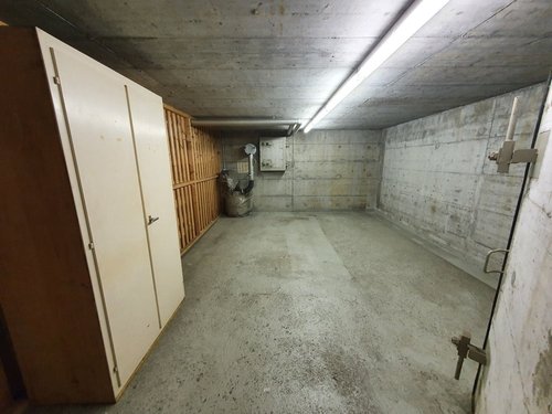 Das Lager ist ca. 26m2 gross. Der Zugang erfolgt mittels Rampe ins UG, anschliessend über eine Betonschwelle durch den Velokeller in einen Zivilschutzraum.