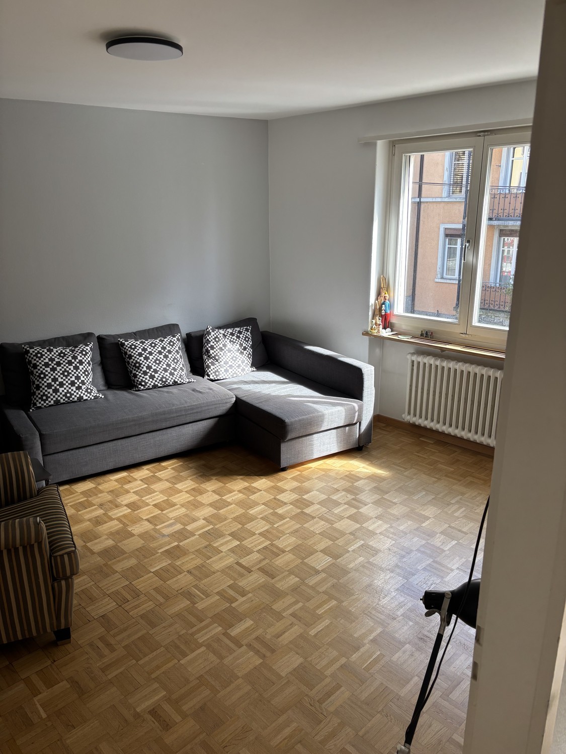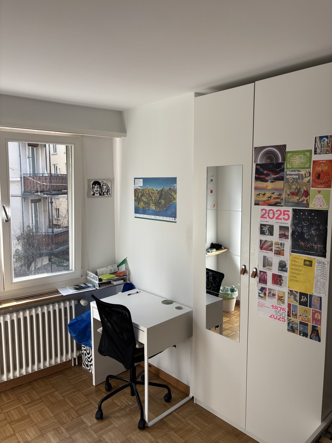 Die WG liegt direkt am Hegibachplatz, an der Grenze zwischen den Kreisen 7 und 8, und ist hervorragend an den öffentlichen Verkehr angebunden. Der Zürichsee und der Bahnhof Stadelhofen sind jeweils nur knapp über 1 km entfernt. The shared apartment is located right on Hegibachplatz, on the border between districts 7 and 8, and has excellent public transportation access. Lake Zurich and Stadelhofen Station are both just over 1 km away. Das Zimmer ist gross und hell. Es ist vollständig möbliert, die Möbel müssen vom Nachmieterin übernommen werden. Die restliche Wohnung wird gemeinsam genutzt: Essbereich/Eingang, Wohnzimmer, Küche, Badezimmer und ein separates WC. Kleinere Nebenkosten sind zusätzlich zur Miete zu tragen. The room is large and bright. It is fully furnished; the furniture must be taken over by the next tenant. The rest of the apartment is shared: dining area/entryway, living room, kitchen, bathroom, and a separate toilet. There are also some additional bills which are not included in the rent. Wir suchen eine ruhige und unkomplizierte junge Berufstätigen. Erzähl uns doch bitte etwas über dich und warum du denkst, dass du gut in unsere WG passen würdest. Bitte bestätigen du in deiner Nachricht, dass du die Möbel gerne übernehmen möchtest. We're looking for a calm and easy-going young professional. Please tell us a little about yourself and why you think you'd be a good fit for our shared apartment. In your message please confirm that you are happy to take over the furniture. In der WG wohnen derzeit Joseph (aus Irland), der auszieht, und Robin (aus der Schweiz), der als Journalist arbeitet. Gesucht wird eine ruhige, berufstätige Person, die Josephs Zimmer übernimmt. The shared apartment is currently home to Joseph (from Ireland), who is moving out, and Robin (from Switzerland), who works as a journalist. We are looking for a quiet, working professional to take over Joseph’s room.