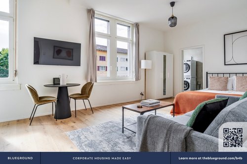 Wie bei jedem Blueground Wohnung finden Sie einen durchdacht gestalteten Raum mit schönen Möbeln. und eine voll ausgestattete Küche in diesem Studio Immobilie. Und dank unserer hochwertigen Matratzen können Sie sich entspannen, weil Sie sich immer wie zu Hause fühlen werden. Wenn Sie Lust auf etwas Spaß haben, können Sie die Zurich -Atmosphäre genießen oder sich die Unterhaltung mit dem kabellosen Premium-Lautsprecher oder dem Smart-TV direkt nach Hause holen. Diese Wohnung bietet auch Wäscherei in der Wohnung.