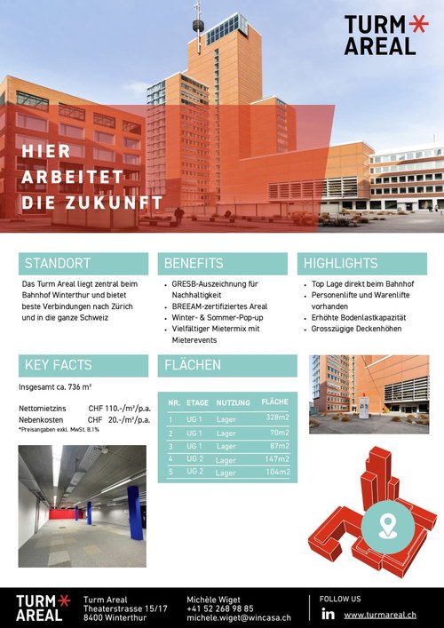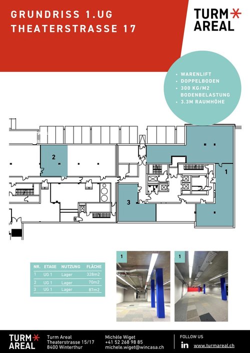 An zentraler Lage an der Theaterstrasse 1517 in Winterthur, direkt neben dem Bahnhof, stehen vielseitig nutzbare Lagerflächen von ca. 70 m² bis 328 m² zur Verfügung. Sofort bezugsbereit zum attraktiven Mietzins von CHF 110./m²/pa. netto zzgl. Nebenkosten und MWST. Jetzt profitieren: 1 Monat gratis! Ihre Vorteile auf einen Blick: Beste Lage: Direkt beim Bahnhof Winterthur Einfache Anlieferung: Warenlift und Zugang mit Palettenrolli Flexible Nutzung: Dank Doppelboden Optimale Raumhöhe: ca. 284 340 cm Grundausstattung: Beleuchtung und mindestens eine Steckdose pro Raum Hohe Traglast: ca. 24 kN/m² Ob als Lager für Ihr Unternehmen, für laufende Projekte oder als zusätzlicher Stauraum diese Flächen passen sich Ihren Bedürfnissen an. Interessiert? Gerne informieren wir Sie persönlich und zeigen Ihnen die verfügbaren Flächen. Wir freuen uns auf Ihre Kontaktaufnahme!