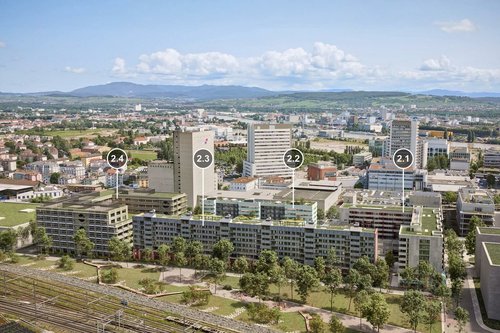 Im Gebäude 2.1 liegen die frei unterteilbaren Büroflächen mit insgesamt rund 2100m2 Geschossfläche. Diese sind unterteilbar von ca. 312m2 an aufwärts – Die Flächen werden im Grundausbau vermietet, sprich Rohbau plus Toilettenanlagen. Die technischen Leistungen wie Lüftung und Kühlung sind bis an die Mietfläche geführt. Sehr gerne unterstützen wir Sie in Ihrem Ausbauprojekt.