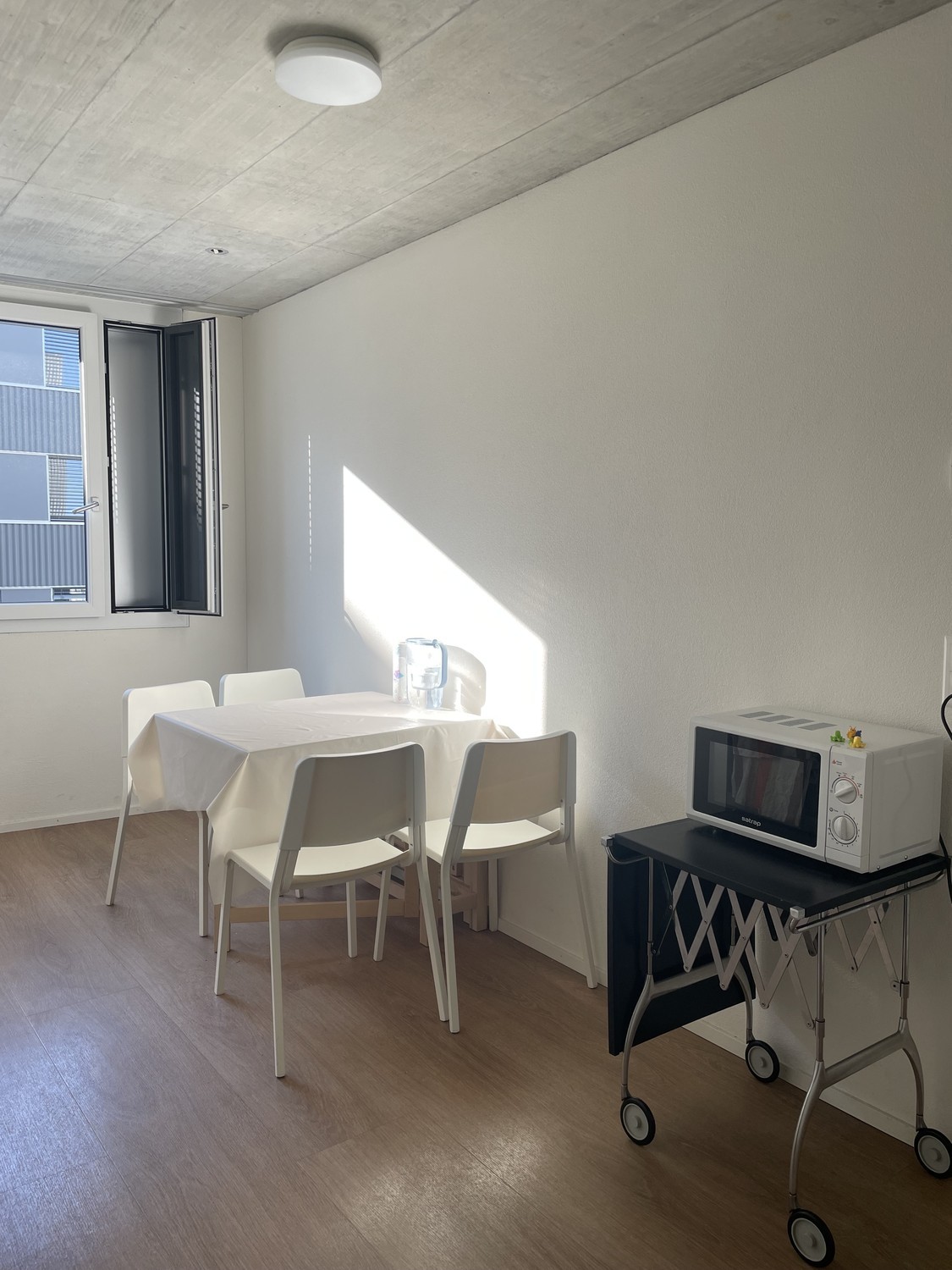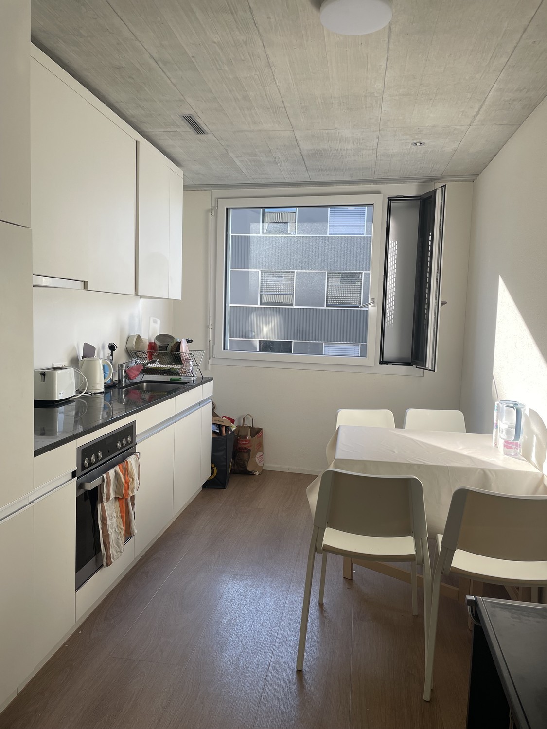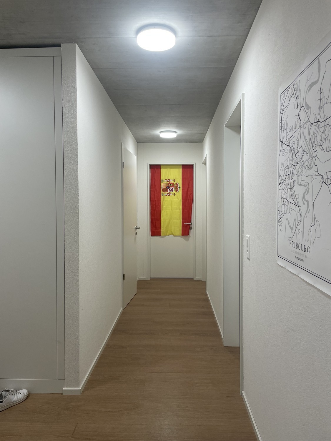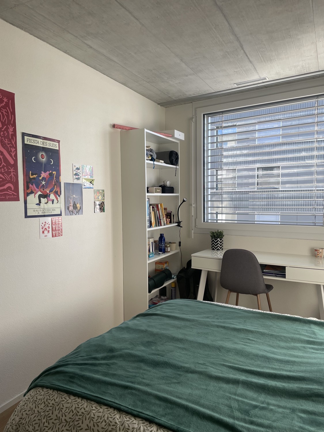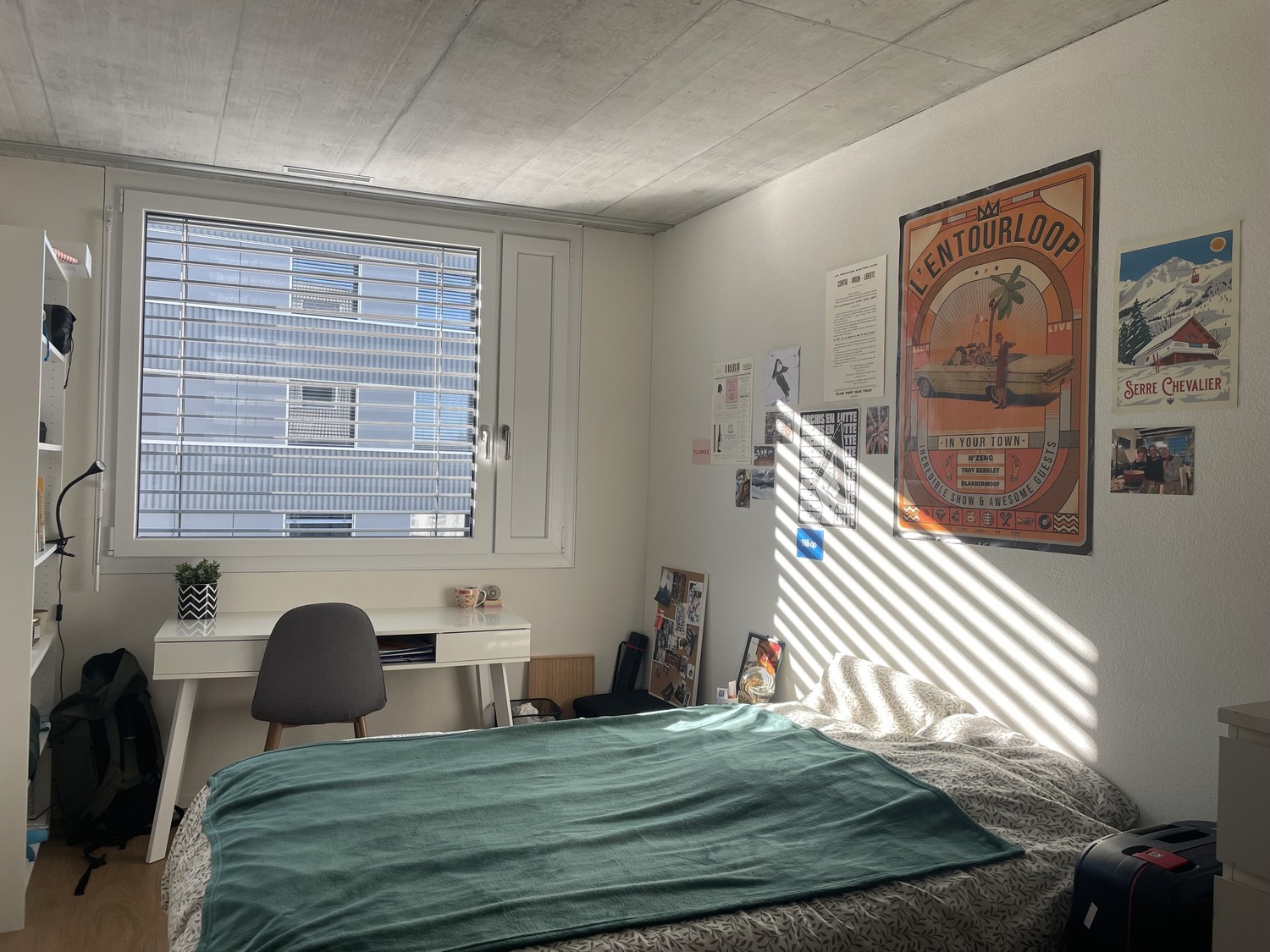 Chambre de 12m2 non meublée en colocation à Fribourg, dans les logements Apartis. L’appartement se situe Route de la Fonderie 14, c’est une colocation de 4 filles. 7 pièces, il y a une cuisine et deux salles de bains avec un casier personnel et des machines à laver au 1er étage de l’immeuble.
