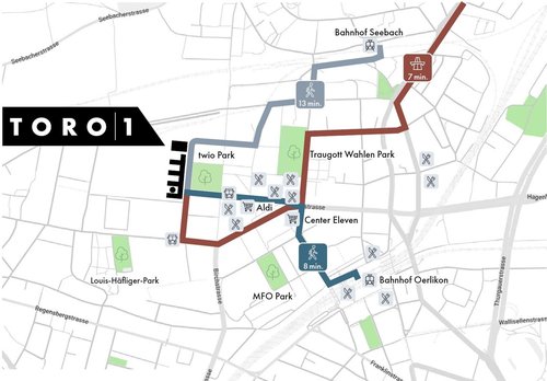 lebendiges Viertel, das moderne Arbeitsplätze, ansprechende Parks und eine hervorragende Infrastruktur vereint. Wir vermieten per 1. Juli 2026 oder nach Vereinbarung eine im Jahr 2021 umfassend sanierte und modernisierte Bürofläche. Die Bürofläche bietet: 200 Meter zur nächsten ÖV-Haltestelle Wenige Gehminuten zum Bahnhof Oerlikon Eigenes Parkhaus mit der Möglichkeit, Parkplätze anzumieten Sportler-Garderobe mit Duschen Mitarbeiterrestaurant Sitzungszimmer und Konferenzräume fleibel anmietbar Grosser Velo- & Motorradabstellplatz direkt hinter dem Gebäude Reservierbare Besucherparkplätze vor dem Gebäude Panoramablick auf den Oerliker Park und eigene Biotope Individuelle Ausbaumöglichkeiten nach Ihren Wünschen Weitere Details und Eindrücke finden Sie auf unserer Areal-Website: www.toro1.ch Haben wir Ihr Interesse geweckt? Dann freuen uns auf Ihre Kontaktaufnahme!