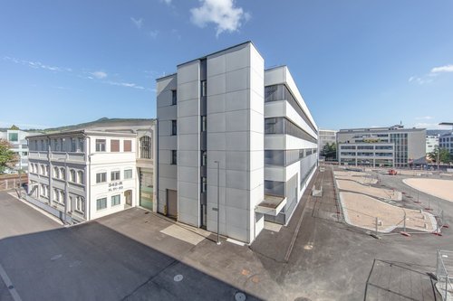 Der Gebäudekomplex mit angebautem Bürotrakt liegt am Brown Boveri Platz, der im nächsten Frühling wiedereröffnet und zum neuen Treffpunkt wird.