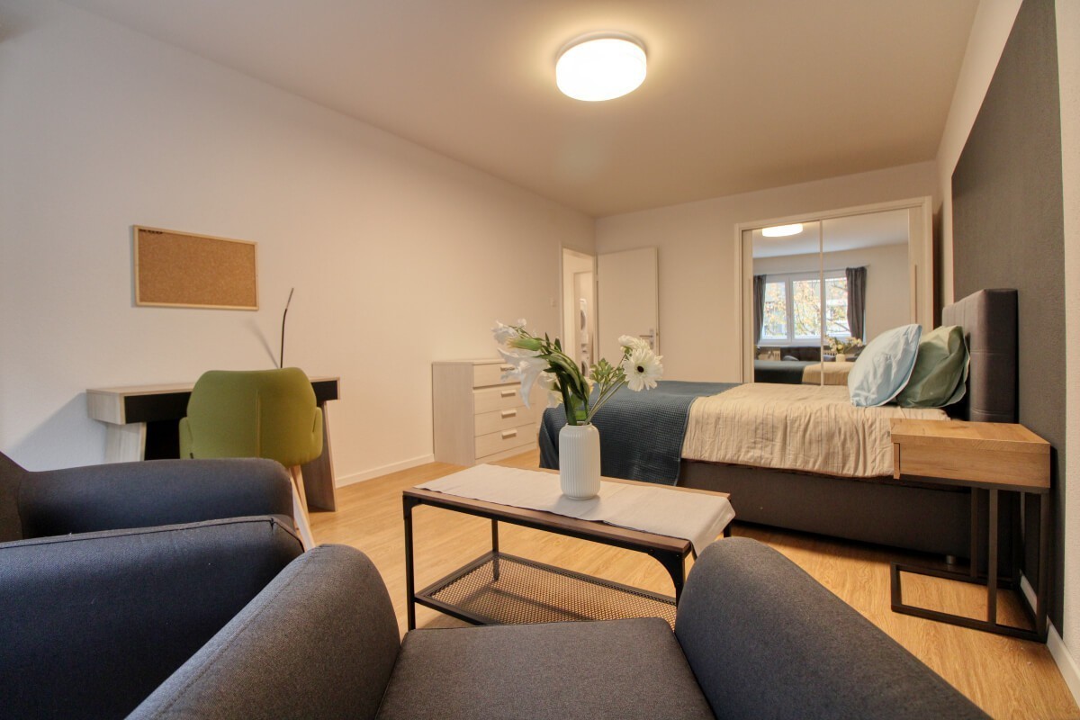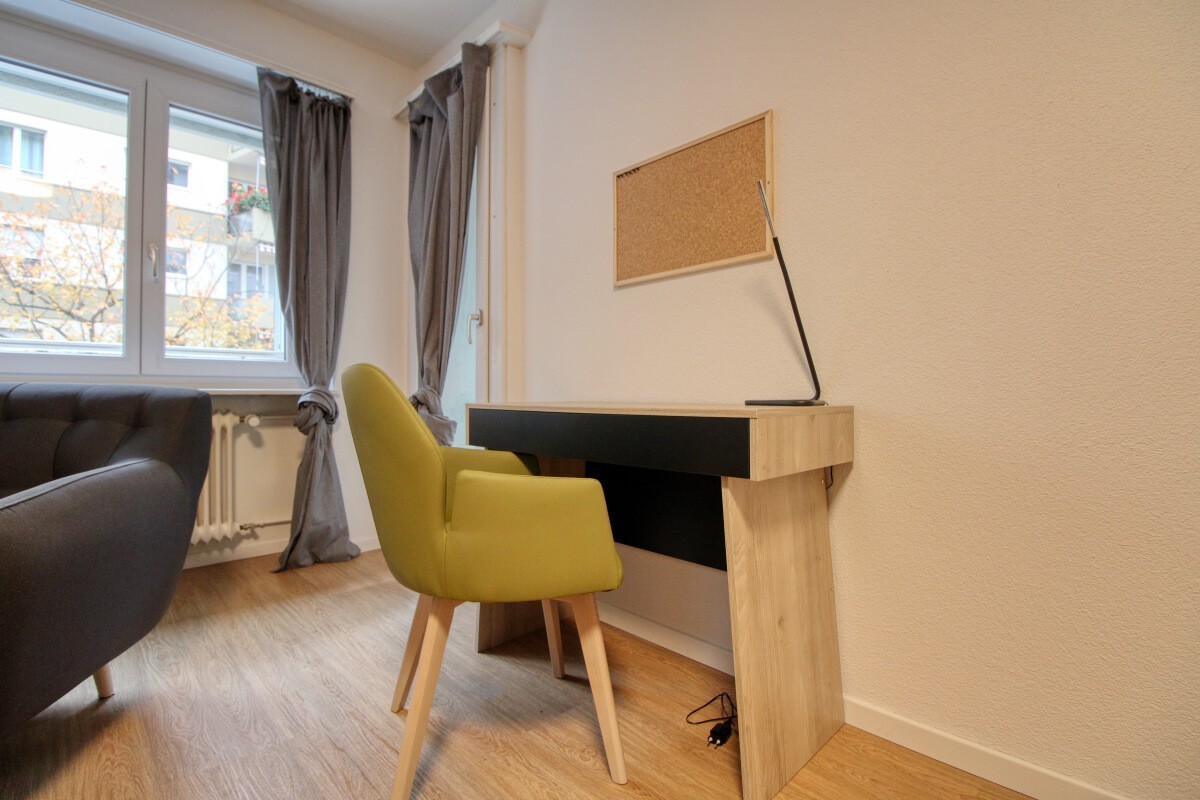 Dieses WG-Zimmer bietet die folgende Ausstattung: 3 Mitbewohner Küche mit Küchenausstattung Bad/WC Möbliertes Zimmer Wasser und Stromgebühren Internet Reinigung der Gemeinschaftsräume Staubsauger für gemeinschaftliche Verwendung Room Estate ist ein Anbieter von möblierten Zimmern mit Service an verschiedenen Standorten in der Schweiz und Deutschland. Unsere Mieter reichen von jungen Arbeitstätigen über Praktikanten bis hin zu Studenten, die es schätzen neue Leute kennenzulernen sowie bequem und komfortabel zu wohnen. Bei Room Estate können Sie sich direkt online für das Zimmer anmelden. Einfach Konto erstellen, anmelden und in 48 Stunden Bescheid bekommen. Alle unsere Zimmer können Sie mittels der virtuellen 360° Tour anschauen. Es ist auch durchaus möglich das Zimmer ohne Besichtigung zu mieten. Für mehr Informationen: https://roomestate.com/de/room/67-3 This shared room offers the following facilities: 3 flatmates Kitchen with kitchen equipment bathroom/toilet Furnished room Water and electricity charges Internet Cleaning of common areas Vacuum cleaner for communal use Room Estate is a provider of furnished rooms with service at various locations in Switzerland and Germany. Our tenants range from young professionals to interns to students who enjoy meeting new people as well as living in comfort and convenience. At Room Estate you can register for a room directly online. Simply create an account, register and you will be notified within 48 hours. We offer a virtual 360° tour through all of our rooms. It is also possible to rent the room without actually viewing it. For more information: https://roomestate.com/en/room/67-3