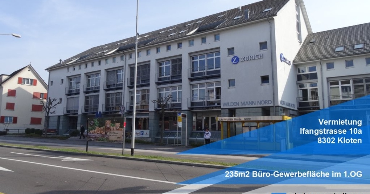 Das Geschäftshaus "Wilder Mann Nord" ist in Kloten der Begriff für schöne und repräsentative Geschäftslokalitäten. Durch die zentrale und strategisch gute Lage gelangen Ihre Kunden über die Hauptverkehrsachsen sowie den öffentlichen Verkehr in kurzer Zeit zu Ihnen und wieder nach Hause.
