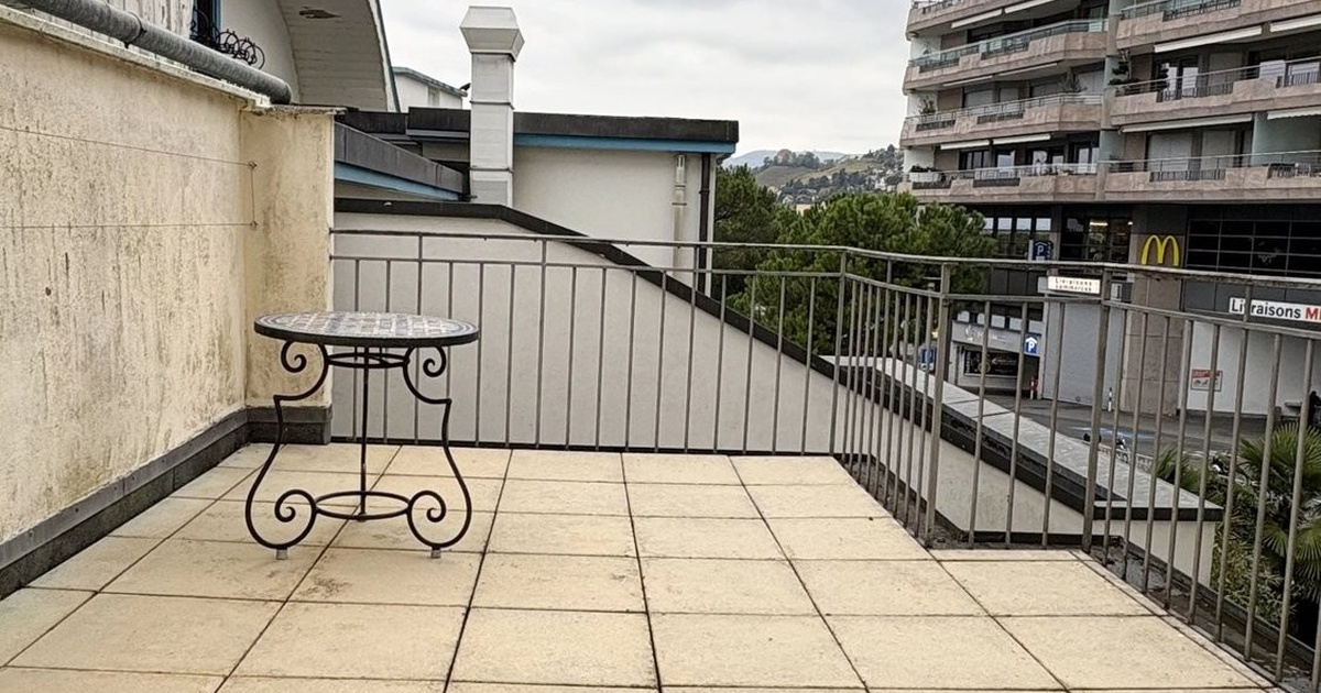 Appartement de 2.5 pièces avec terrasse au coeur de Montreux A louer, en plein coeur de Montreux, appartement de 2.5 pièces avec terrasse Distribué comme suit : – Entrée avec armoires – Cuisine parfaitement agencée semi-ouverte sur le séjour – Séjour Est avec vue sur le lac et les Dents du Midi – Chambre à coucher Ouest équipée d'armoires avec accès à la terrasse – Terrasse de 15 m2 – Une salle de douches/wc/lavabo – Colonne de lavage Loyer CHF 1'820.00 + forfait charges CHF 180.00. Disponible de suite.