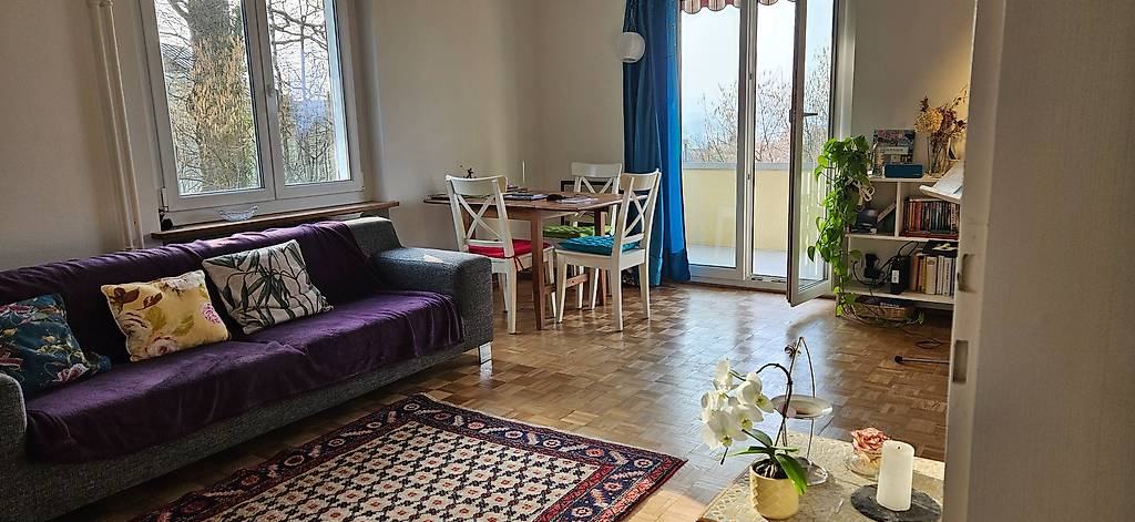 Das Zimmer in der 3 1/2 Zimmer-Wohnung im Wesemlin Luzern ist grosszügig, hell, ruhig mit 2 Fenstern und schöner Aussicht (Bäume), Hochparterre. Balkon (sehr sonnig), Küche, Bad (Duschbadewanne) und Keller zur Mitbenützung, WLAN vorhandenIch (w 50+/NR) suche für max. 1 Jahr eine Mitbewohnerin (w), evt. Studentin, die einen ruhigen Platz sucht und Wochenaufenthalterin ist. Ich kann mir aber auch eine Person in ähnlichem Alter vorstellen. Jeder kann eigenständig sein, aber auch mal eine gemeinsame Unternehmung möglich