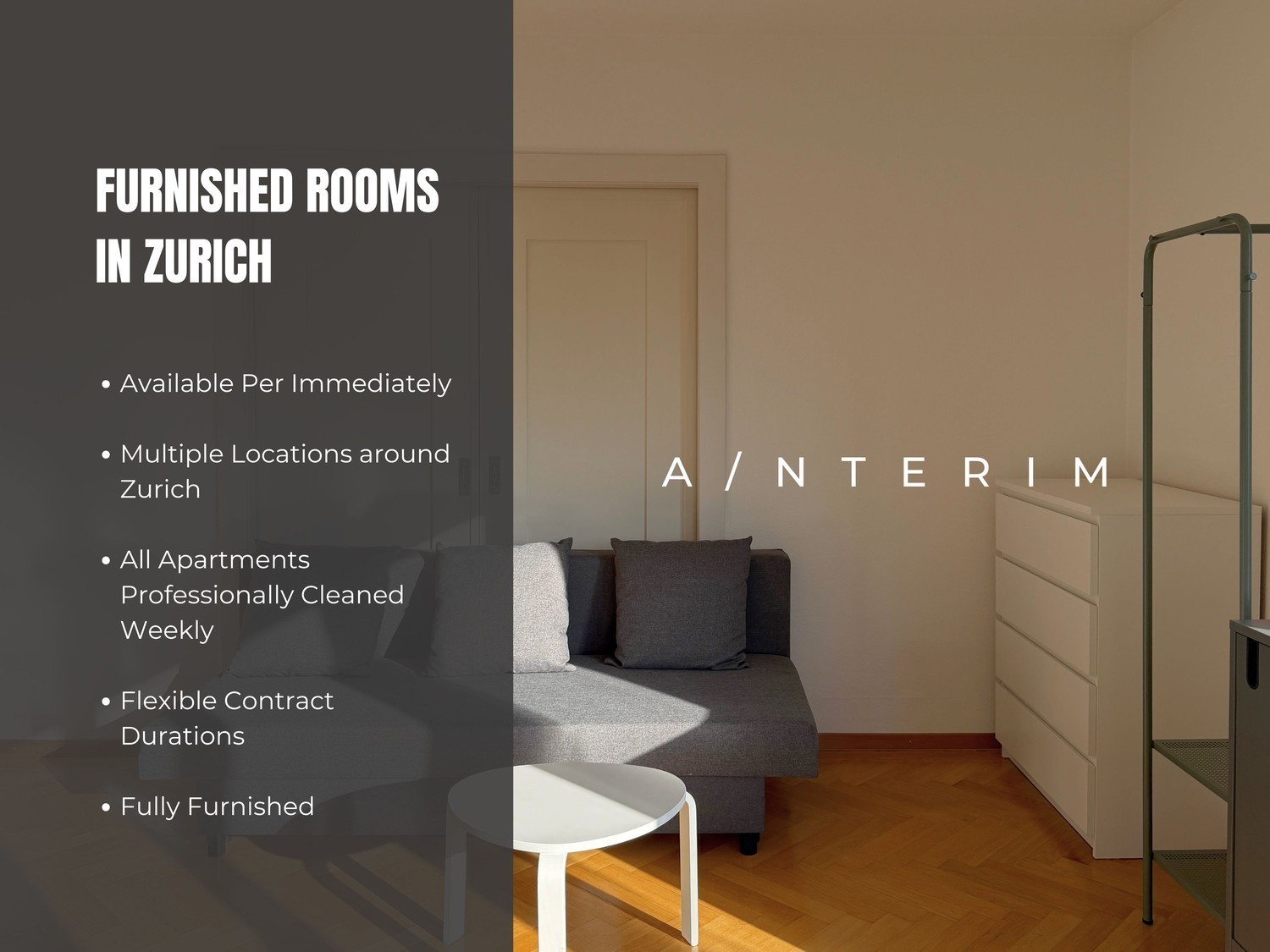 FURNISHED ROOMS AROUND ZURICH by A/NTERIM Note: These Properties are at a different Address than this ad. Available rooms may be in different locations across the Zurich area. (Wollishofen, Zollikon, Kilchberg, Aarau) We offer fully furnished rooms in professionally managed flatshares, ideal for anyone looking for a comfortable, hassle-free living experience. Each apartment features: Fully equipped shared kitchens & bathrooms Weekly cleaning service included Modern interiors with a clean, streamlined design Furnishings such as: bed, desk, chair, wardrobe/storage, clothing rack Larger rooms with additional living space (e.g., sofa/lounge area)We currently have availabilities in Zollikon, Wollishofen (Kreis 2), Kilchberg, Rüschlikon and Aarau. Prices range from CHF 950 to CHF 1'550 per month, depending on room size and location. Whether you’re relocating, starting a new chapter in Zurich, or simply need a flexible living solution, we help you find the room that fits your needs —quickly and without complications. Contract Options: ECO Rooms, Option A: Min. 5-Months Fixed-Term Contract. Monthly Payment. 1-Month Rent Deposit.ECO Rooms, Option B: 2–3-Month Contract. One Instalment Payment for full duration.* 25–35% Deposit on total stay fee.(All contracts have a one-time fee of CHF 45-75 for the room preparation and cleaning) Prefer a place all to yourself? Get in touch! Our STANDARD and SIGNATURE apartments give you flexible options tailored to your needs. A/NTERIM; more than just accommodation – it’s a flexible home designed for focus, community, and convenience.