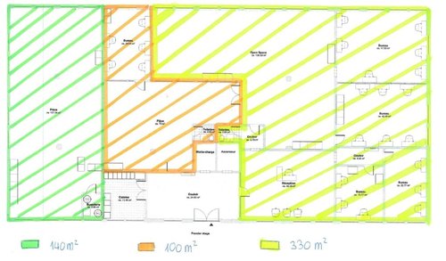 La surface se compose comme suit : • Vaste entrée • 2 bureaux fermés ou salles de conférence • 2 open space d'environ 93m2 et 136m2 • Cuisine commune • WC