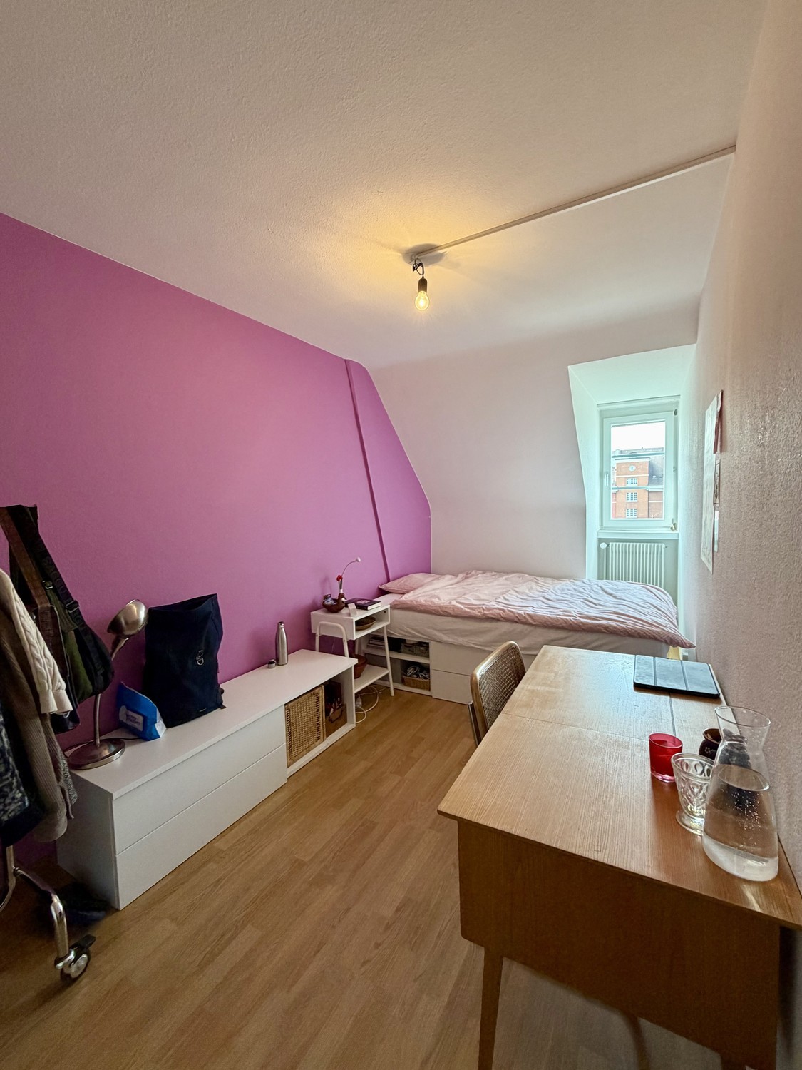 Ich suche jemanden, der mein Mansardenzimmer beim Viktoriaplatz per Mai (oder nach Absprache) übernimmt. Im Mietpreis sind alle Nebenkosten miteinbegriffen. Das Zimmer läuft unter einem befristeten Untermietvertrag bis August, hat aber die Aussicht auf Verlängerung, sprich unbefristet. Dieses Zimmer und auch die anderen Mansardenzimmer werden ausschliesslich an Frauen vermietet. Das Zimmer ist sehr zentral gelegen - 3 Minuten vom Viktoriaplatz entfernt, ÖV-Verbindungen mit denen man in 10 Minuten den Bahnhof erreicht und einen Spaziergang vom Rosengarten entfernt. Jedes Mansardenzimmer wird einzeln vermietet, auch mit eigenem Briefkasten und Türklingel. Dementsprechend handelt es sich nicht wirklich um eine WG - jeder macht sein eigenes Ding. Die Küche und das Badezimmer werden mit den anderen Mansardenbewohnerinnen geteilt. Es gibt zwei Kühlschränke aber keinen Geschirrspüler. Im Badezimmer hat jede Partei ein eigenes Lavabo, die zwei Duschzellen und die zwei WC's werden geteilt. Zudem verfügt das Zimmer noch über ein eigenes Estrichabteil. Die Waschküche befindet sich im Keller und wird nur von den Mansardenbewohnerinnen benutzt - dementsprechend ist es meistens frei und benötigt auch keinen Waschplan. Das Haus verfügt zudem über einen Lift - die Wohnung befindet sich im obersten (5.) Stock. Ideal wäre das Zimmer für jemanden, der eine zentrale, günstige Bleibe in Bern sucht - es gibt zwei Wochenaufenthalterinnen in den anderen Mansardenzimmern, eine Seniorin und zwei Studentinnen, ich miteinbegriffen. Das Zimmer ist recht klein mit ungefähr 10 Quadratmetern, wenn man es gut einrichtet passt es aber für das Nötige. Es wird unmöbliert vermietet, falls das Bett abgekauft werden möchte, könnte dies besprochen werden. English below I am looking for someone to take over my attic room near Viktoriaplatz starting in May (or by arrangement). All utilities are included in the rent. The room is currently under a fixed-term sublease agreement until August, but there is a possibility of extension, meaning it could become a permanent lease. This room, as well as the other attic rooms, are rented exclusively to women. The room is very centrally located—3 minutes from Viktoriaplatz, with public transportation that takes you to the train station in 10 minutes, and a short walk from the Rosengarten. Each attic room is rented individually, complete with its own mailbox and doorbell. Accordingly, it’s not really a shared apartment—everyone does their own thing. The kitchen and bathroom are shared with the other attic residents. There are two refrigerators but no dishwasher. In the bathroom, each resident has their own sink; the two shower stalls and two toilets are shared. The room also has its own attic compartment. The laundry room is located in the basement and is used only by the attic residents—so it’s usually free and doesn’t require a laundry schedule. The building also has an elevator—the apartment is on the top (5th) floor. This room would be ideal for someone looking for a central, affordable place to stay in Bern—there are two other weekly tenants in the attic rooms: an elderly woman and two students, myself included. The room is quite small, about 10 square meters, but if you arrange it well, it has enough space for the essentials. It is being rented out unfurnished; if you’d like to buy the bed, we can discuss that.