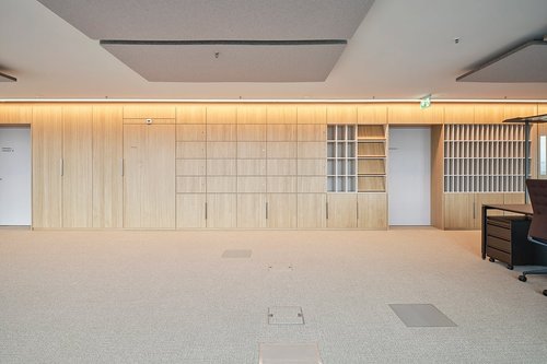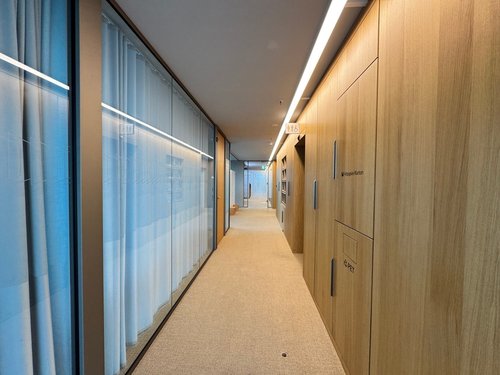 Die Fläche befindet sich derzeit noch nicht im dargestellten Ausbauzustand, kann jedoch innerhalb von ca. 4–6 Monaten als bezugsbereites Büro übergeben werden. Ein mietereigenes Ausbaulayout kann selbstverständlich realisiert werden.