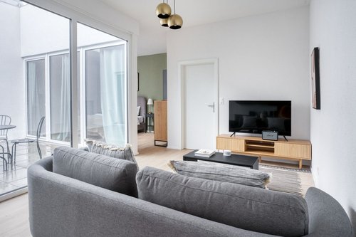 Wie bei jedem Blueground Wohnung finden Sie einen durchdacht gestalteten Raum mit schönen Möbeln. und eine voll ausgestattete Küche in diesem Ein-Schlafzimmern Immobilie. Und dank unserer hochwertigen Matratzen können Sie sich entspannen, weil Sie sich immer wie zu Hause fühlen werden. Wenn Sie Lust auf etwas Spaß haben, können Sie die Basel -Atmosphäre genießen oder sich die Unterhaltung mit dem kabellosen Premium-Lautsprecher oder dem Smart-TV direkt nach Hause holen. Diese Wohnung bietet auch Wäscherei in der Wohnung.