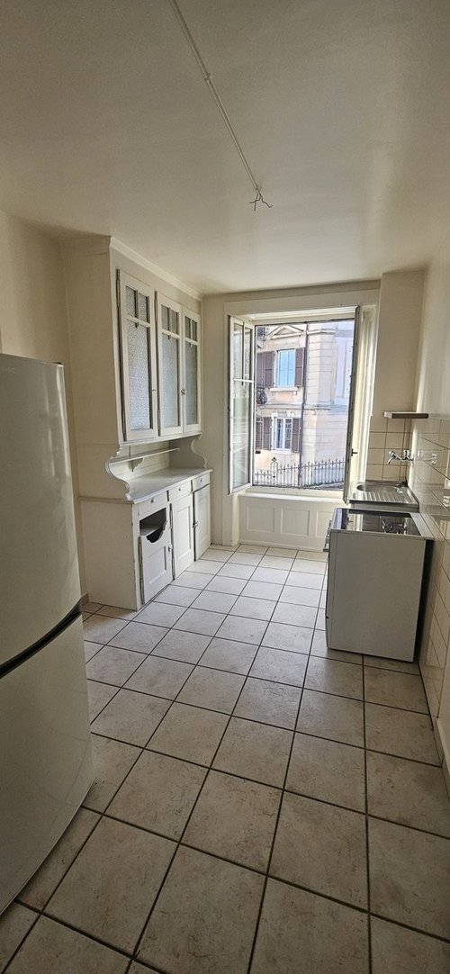 Cuisine agencée, 2 chambres à coucher, 1 salon, salle-de-bains, WC séparé. Réduit. Balcon - Petits commerces et arrêts de bus à proximité.