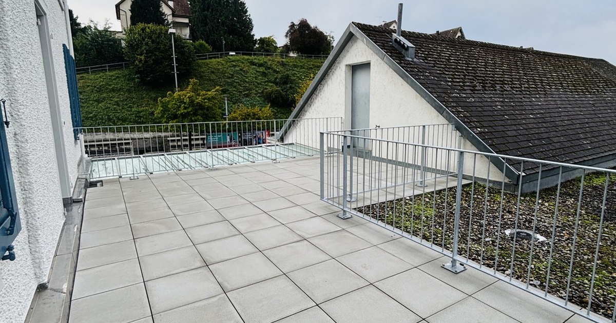 Eine weitläufige Terrasse lädt zum Verweilen ein und steht beiden Wohnparteien zur Verfügung • ideal für gemütliche Sommerabende • viel Platz zum Entspannen und Geniessen • viel Raum für Erholung im Freien