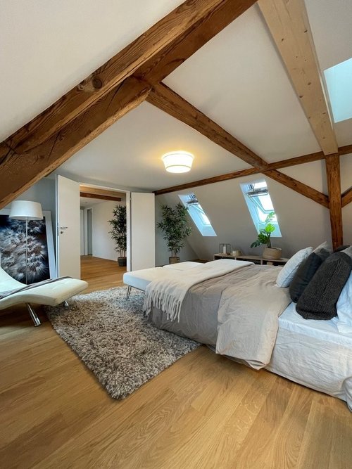 Helle Räume mit viel Tageslicht, charmante Dachschrägen und ein warmer Parkettboden.