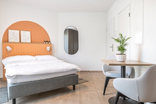 Do you want to experience Basel? Then Strassburgerallee 1 is the right place for you. In only 10 minutes you are at the main train station and also at the airport. The old town, various cafés along the river Rhine and a small park are also in the direct vicinity of the apartment. You can do all your grocerie shopping in one of the two large super markets (Migros and Denner), which are within walking distance. If you don't feel like cooking, you can indulge yourself in the various restaurants in the neighborhood. You can find some of our favorite restaurants in our WOW Guide. What about the building? It was renovated a few years ago. From October 2022 onwards, the apartments will operate under a customized concept specifically designed to meet the needs of serviced apartment guests. The building has seventeen 1.5 room apartments (3 of which have balconies), nine 2.5 room apartments (8 of which have balconies) and one 4.5 room maisonette (with balcony) on the top floor with views over Kannenfeld Park. Our serviced apartments are fully furnished and have a high-speed internet line, which is ideal for everyone who also likes to work efficiently from home. For us, "fully furnished" means everything that is important for the apartment, from the kitchen equipment with crockery and cutlery, to the kettle and iron, to the bed linen and towels. Besides the basics, the smart TV will keep you entertained on rainy days. The TV subscription is already set up upon your arrival and you only need to choose the movie. The pre installed SONOS sound systems and our various WOW playlists will guarantee to get you going in the monring and have some groovy times in your apartment. All furnished apartments have spacious built-in closets. If you need additional storage space, we will be happy to provide you with storage rooms in the building. If you are traveling by car, we can arrange parking for you in the surrounding area. However, from our serviced apartments you should be able to reach all important parts of the city comfortably by public transport or the WOW e-scooters that are available in all the apartments.