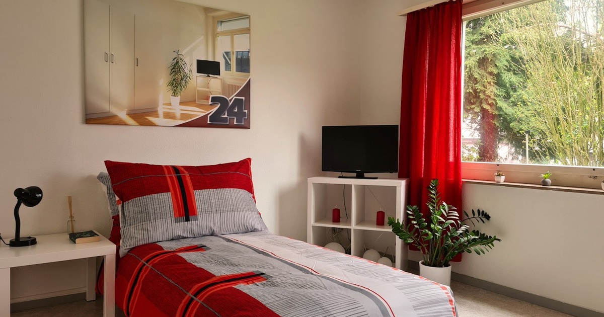 English text bellow Wir bieten Ihnen ein gepflegtes möbliertes Zimmer in Frauenfeld an. Die Wohnung wird wöchentlich wird – und dieser Service ist bereits in der Miete enthalten. Sauberkeit ist uns sehr wichtig! Das Zimmer ist hell und modern eingerichtet, mit einem bequemen Bett, einem Tisch mit Stuhl, einem grossen Kleiderschrank, Lampen, einem Regal und einem LCD-TV. Sie erhalten zudem kostenloses WLAN. Alle Nebenkosten, einschliesslich Strom, Wasser und Heizung, sind in der Miete enthalten. Sie teilen sich das Badezimmer und die Küche mit freundlichen und ruhigen Mitbewohnern. Wir verlangen keinen Betreibungsauszug und keine Arbeitgeberbescheinigung. Gerne können Sie das Zimmer persönlich besichtigen. Wir freuen uns auf Ihre Anfrage. Bitte beachten Sie, dass es sich bei den bereitgestellten Bildern um Beispielbilder handelt. English We are offering you a well-maintained furnished room in Frauenfeld. The apartment is cleaned weekly – and this service is already included in the rent. Cleanliness is very important to us! The room is bright and modernly furnished, with a comfortable bed, a table with a chair, a large wardrobe, lamps, a shelf, and an LCD TV. You will also receive free WiFi. All additional costs, including electricity, water, and heating, are included in the rent. You will share the bathroom and the kitchen with friendly and quiet housemates. We do not require a debt enforcement extract or an employer's certificate. You are welcome to personally inspect the room. We are looking forward to your inquiry. Please note that the images provided are of sample pictures.