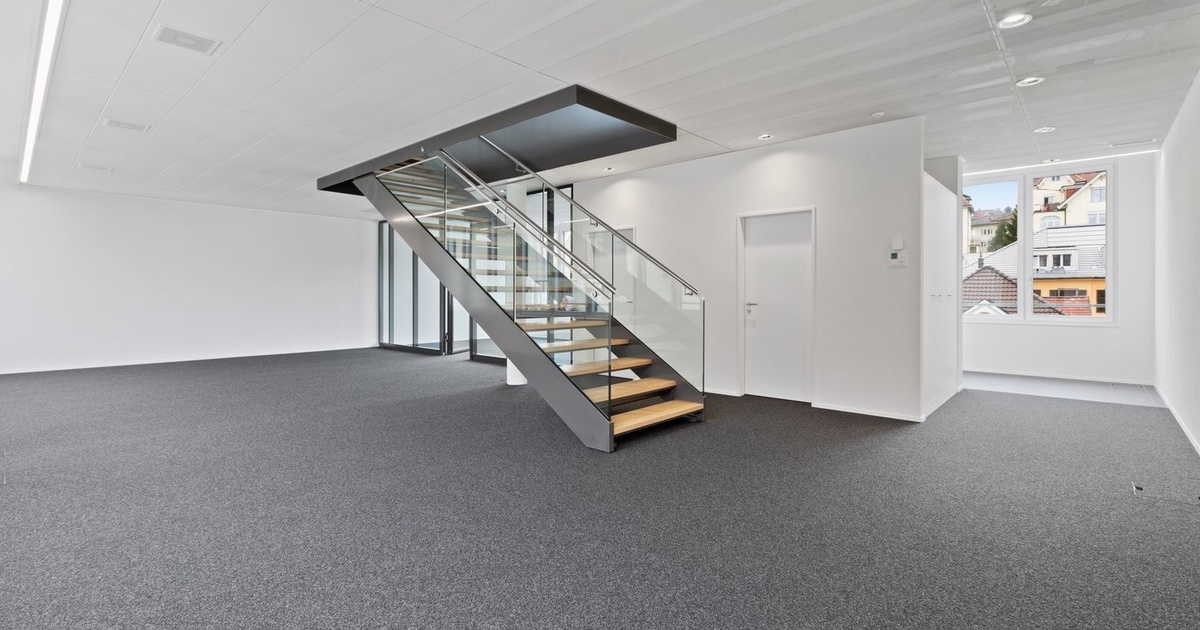 Die interne Treppenverbindung verbindet die Ebenen elegant und sorgt für kurze Wege zwischen den Abteilungen – ein Pluspunkt für effiziente Zusammenarbeit und ein dynamisches Arbeitsumfeld. • Vollausgebaut mit Toiletten und Teeküche • Interne Treppenverbindung – optimale Verbindung der Geschosse • Parkplätze à CHF 160.00/Monat, Besucherparkplätze vorhanden • Lifte vorhanden • Beschriftungsmöglichkeit auf Stele beim Eingang