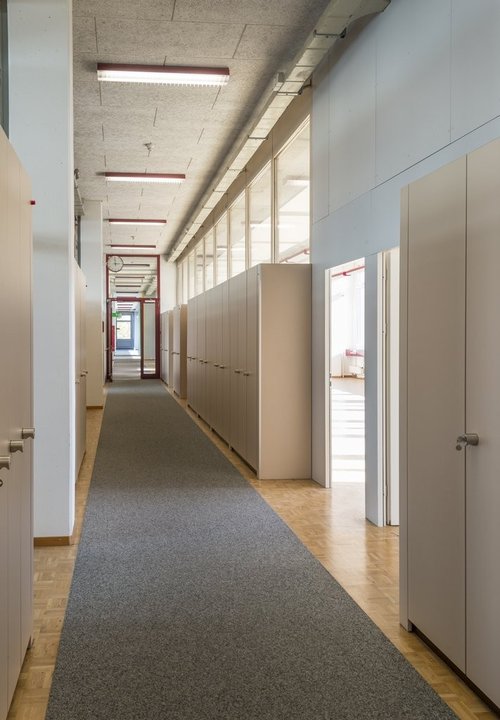 Das Bürogebäude "Gustav" bildet gemeinsam mit der Tannerie einen zusammenhängenden Campus. Die hervorragende Anbindung an den öffentlichen Verkehr sowie die Nähe zur Autobahn machen dieses zu einem idealen Standort für Mitarbeitende sowohl aus der näheren Umgebung wie auch von weiter weg.