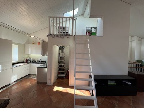 Proseguiamo al piano giorno dove troviamo una moderna e ben accessoriata cucina aperta sulla zona pranzo, un bagno di servizio con spazio adibito ad una colonna lava e asciuga . Il soggiorno é molto luminoso e spazioso, a renderlo unico é un bellissimo soppalco raggiungibile con una moderna e pratica scala .