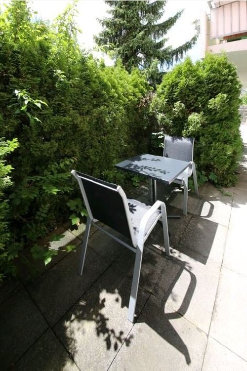 The well-kept, fully furnished studio apartments on the ground floor all have a west-facing terrace surrounded by greenery, with plenty of evening sun.