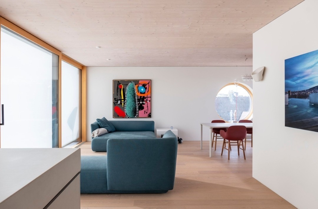 This absolutely quiet high-end 100m2 apartment (Penthouse) was designed by dade-design and features brands like GESSI, MDF Italia, MIELE, BORA, and Viabizzuno. Bedroom with own shower, built in wardrobe and office desk. Fully equipped kitchen, dining table and cuttlery for 6 people. Wine fridge. Illy espresso, BBQ, washing machine, terrace, WiFi, etc ...all included Rent all-in: 1850 (WiFi, electricity, etc Cleaning weekly and bedding. Parking (140 extra) Flat-share with an entrepreneur which is almost never in Zurich (3 residences). 15min from the airport with tram line 10 10min to the city center with 4 direct tram lines