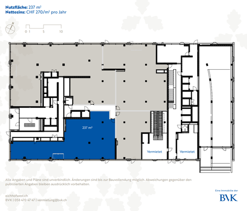 Direkt an der Grenze zu Luzern entsteht mit dem «Eichhof West» eines neues Quartier mit 234 Mietwohnungen rund 6'000m² Gewerbefläche und dem Sozialversicherungszentrum WAS des Kantons Luzern. Auf dem Areal ist das bis zu 53 Meter hohe Haus «Weitblick» direkt an der Langsägestrasse das weithin sichtbare Wahrzeichen. Die angebotene Gewerbefläche (237m²) befindet sich im Erdgeschoss gegen die Langsägestrasse ausgerichtet. Die rund 17 Meter Schaufensterfront bietet eine hohe Visibilität. Die Vermieterin übergibt das Mietobjekt im Zustand "Rohbau", dieser beinhaltet: Boden: Doppelboden vorgesehen Wände/Decke: Roh Lüftung/Kühlung: Anschlüsse vorhanden Heizung: Heizkörper/Radiatoren an Fensterfront Elektrisch: Ab Hauptverteilung Mietersache Sanitär: Anschlüsse für WC-Anlage und Teeküche vorhanden Die Tiefgarage bietet Kurzzeitparkplätze für Ihre Kundschaft - die Bushaltestelle «Kriens, Grosshofstrasse» befindet sich direkt vor dem Areal. Diese Fläche ist nicht geeignet für ein Gastronomiekonzept. Hat die Fläche Ihr Interesse geweckt? Wir freuen uns auf Ihre Kontaktaufnahme. «BVK - Die Pensionskasse mit attraktiven Gewerbeflächen in der ganzen Schweiz. Tagesaktuell auf www.bvk.ch»