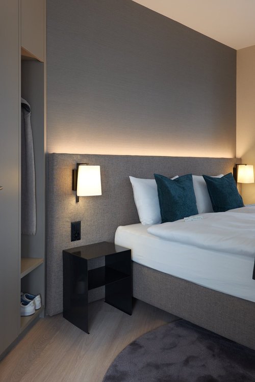 Hochwertige und komfortable Möbel erwarten Sie in Ihrem schönen Apartment. Im ruhigen Schlafzimmer sorgt ein grosses Doppelbett (180×200 cm) mit zwei Nachttischen für den perfekten Schlafkomfort, ein grosser Kleiderschrank für genügend Stauraum und wird durch einen modernen Arbeitsplatz vervollständigt. Das offene lichtdurchflutete Wohn- und Esszimmer verfügt über grosszügige Sitzgelegenheiten mit Esstisch für die ganze Familie, einen zweiten Arbeitsplatz, TV und ein modernes Bettsofa; wodurch das Wohnzimmer auch als zweites Schlafzimmer genutzt werden kann. Eine voll ausgestattete Küche lädt zum gemeinsamen Kochabenden mit Freunden oder der Familie ein.