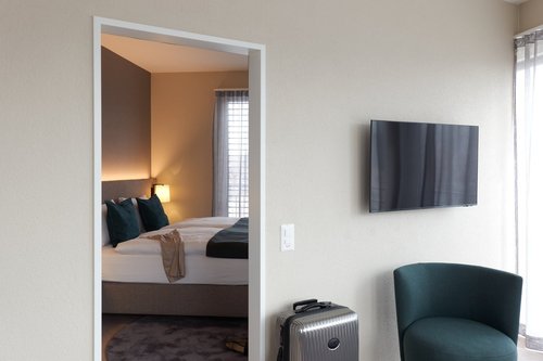 Comfortable furniture of high-quality awaits you in the beautiful apartment. The quiet bed room is equipped with a big double bed (180x200cm) and two bedside tables to ensure a high sleeping comfort, as also with a big wardrobe for sufficient storage room and with a modern work place. The open and very bright living-/dining room offers generous seating and a dining table for the whole family, a second work place, a TV with a modern sofa bed, through which the living room also easily can be used as a second bed room. As the kitchen is fully equipped, nothing holds you back from a nice cooking experience with friends and family.