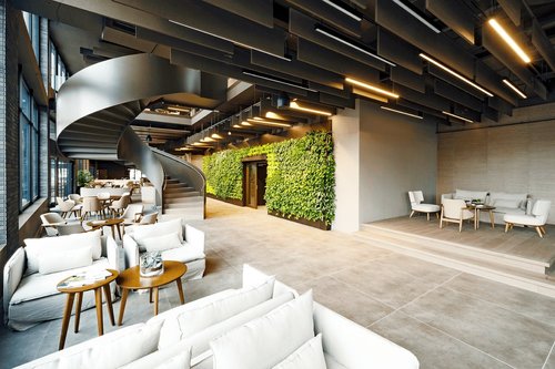 Hinweis: Die gezeigten Bilder sind Visualisierungen des Neubaus H² sowie Beispielaufnahmen aus dem benachbarten Haus der Wirtschaft als Inspiration für mögliche Ausbauvarianten sowie Darstellung dessen Services zur Mitbenutzung.