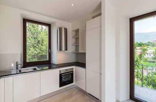 Affittasi elegante appartamento di 3.5 locali disposto su due livelli immerso nel verde e composto da: ingresso, soggiorno con cucina a vista completamente attrezzata e terrazzino, sala da bagno, ampio terrazzo con vista panoramica, due camere da letto e sala da bagno al piano superiore. Lavanderia privata all'interno dell'appartamento.