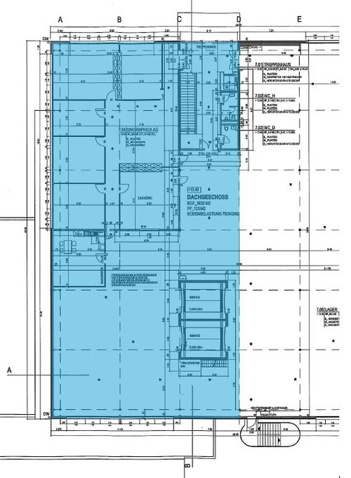 Raumprogramm: • Fläche Lager: ca. 415m² im 3. Obergeschoss • Fläche Büro inkl. Kleinküche: ca. 298 m² im 3. Obergeschoss • Raumhöhe: 2,90 m, stellenweise höher • Bodenbelastung: Bis zu 750 kg/m²