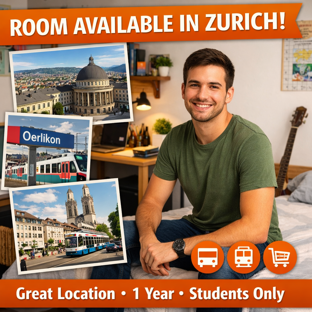Ich biete ein WG-Zimmer in Zürich für 1 Jahr an. Die Wohnung befindet sich in einer sehr guten Lage: ca. 10 Minuten von der ETH (Zentrum und Hönggerberg), Coop in 1 Minute, Bushaltestelle in 1 Minute und Tram in 5 Minuten erreichbar. Der Bahnhof Oerlikon ist in 5 Minuten und der HB in 15 Minuten erreichbar.Zu mir: Ich bin Dominic, 25 Jahre alt, berufstätig und spreche Italienisch, Deutsch und Englisch. In meiner Freizeit mache ich gerne verschiedene Aktivitäten und bin eine offene, positive und unkomplizierte Person.Ich suche einen Studenten, der sauber, ordentlich und freundlich ist, ruhig lebt und Freude daran hat, mit einem jungen, sonnigen und sympathischen Mitbewohner zusammenzuwohnen.Bei Interesse freue ich mich über eine Nachricht!I am offering a room in a shared apartment (WG) in Zurich for 1 year. The location is very convenient: about 10 minutes from ETH (Zentrum and Hönggerberg), Coop 1 minute away, bus stop 1 minute away, and tram within 5 minutes. Oerlikon station is about 5 minutes away and the main station (HB) about 15 minutes.About me: My name is Dominic, I am 25 years old, currently working, and I speak Italian, German, and English. In my free time, I enjoy doing different activities and I am an open, positive, and easy-going person.I am looking for a student who is clean, tidy, friendly, and rather calm, and who enjoys sharing a flat with a young, cheerful, and easy-going flatmate.Feel free to contact me if you are interested!