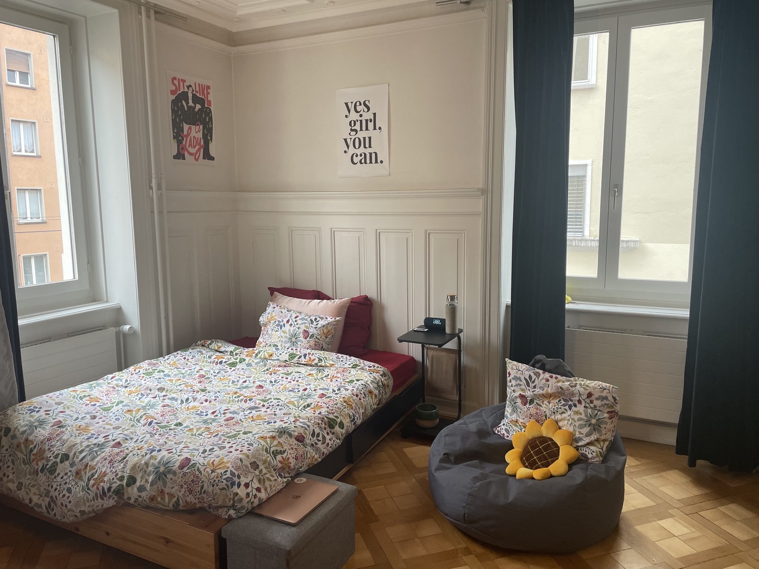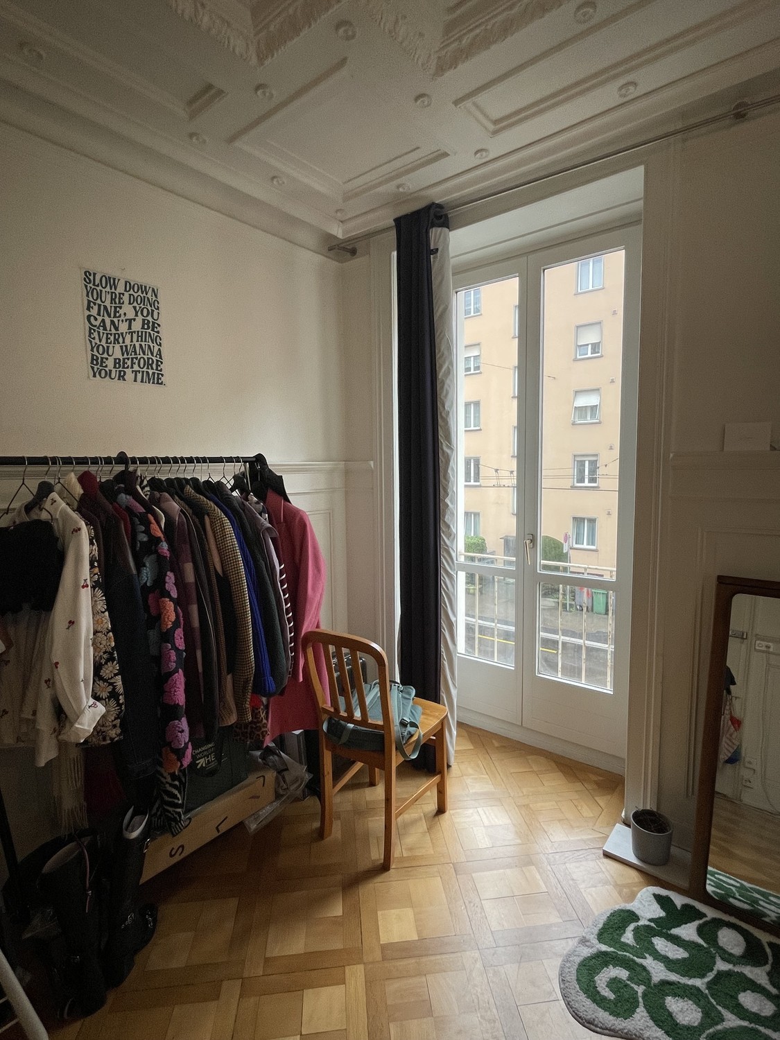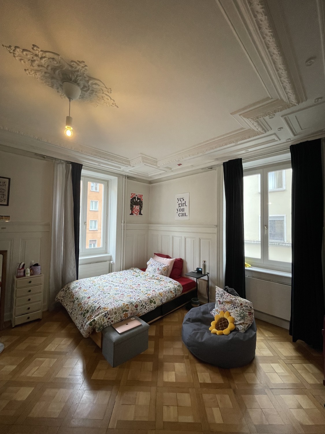 We are looking for a new flatmate to move into the largest room in our beautiful shared apartment, available immediately or by April 1st.The room is fully furnished and includes a bed, dresser, closet, clothing rack, and built-in shelves, offering plenty of storage space. The room is very bright with large windows and features beautiful, intricate ceilings that give the space lots of character.The flat itself is spacious and well-equipped. We have a large kitchen with a dining table, perfect for cooking and sharing meals, as well as a comfortable living room with a sofa. The apartment also includes a shared bathroom with two sinks and a shower/bathtub, a separate toilet, a private washing machine, a dishwasher, and a basement for additional storage.💰 Rent: 1107 CHF/month⚡ Electricity: approx. 30 CHF every two monthsWe’re looking for someone friendly, clean, and easygoing to join the flat. You will share the flat with two male flatmates, Antonio and Pietro (25y and 27y respectively).If this sounds like a good fit for you, feel free to reach out and tell us a little about yourself!