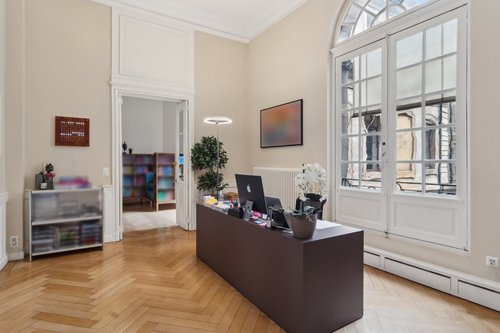 Points forts de cet espace : • Emplacement privilégié : Au cœur du centre historique, à proximité de la Cathédrale Saint-Pierre. • Architecture remarquable : Bâtiment d'époque avec une façade ornée, une cour intérieure élégante et une fontaine centrale. • Intérieur spacieux et lumineux : Hauts plafonds, grandes fenêtres en arc, murs blancs avec boiseries et parquet en bois. • Aménagement flexible : Plusieurs espaces de travail cloisonnés, une salle de réunion et une cuisine équipée.