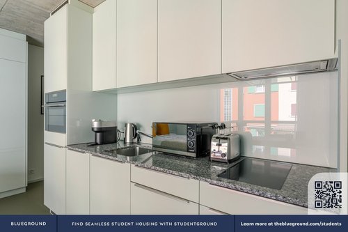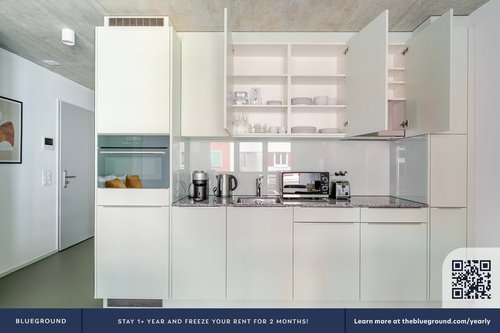Wie bei jedem Blueground Wohnung finden Sie einen durchdacht gestalteten Raum mit schönen Möbeln. und eine voll ausgestattete Küche in diesem Studio Immobilie. Und dank unserer hochwertigen Matratzen können Sie sich entspannen, weil Sie sich immer wie zu Hause fühlen werden. Wenn Sie Lust auf etwas Spaß haben, können Sie die Zurich -Atmosphäre genießen oder sich die Unterhaltung mit dem kabellosen Premium-Lautsprecher oder dem Smart-TV direkt nach Hause holen.