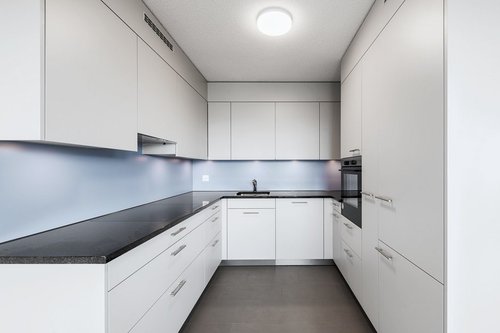 Moderne Küche Die zeitgemässe Küche überzeugt mit Induktionsherd und Geschirrspüler, alle Küchengeräte sind von der qualitativ hochwertigen Marke V-Zug.
