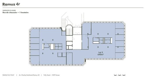 Lots disponibles : L ot 1 - Rez inférieur - Bureau 288 m2 - CHF 350.-/m2/an Lot 2 - Rez inférieur - Bureau 327 m2 - CHF 350.-/m2/an Lot 3 - Rez supérieur - Bureau 640 m2 - CHF 360.-/m2/an Lot 4 - 1er étage - Bureau 266 m2 - CHF 370.-/m2/an Lot 5 - 1er étage - Bureau 375 m2 - CHF 370.-/m2/an Lot 6 - 2ème étage - Bureau 631 m2 - CHF 380.-/m2/an