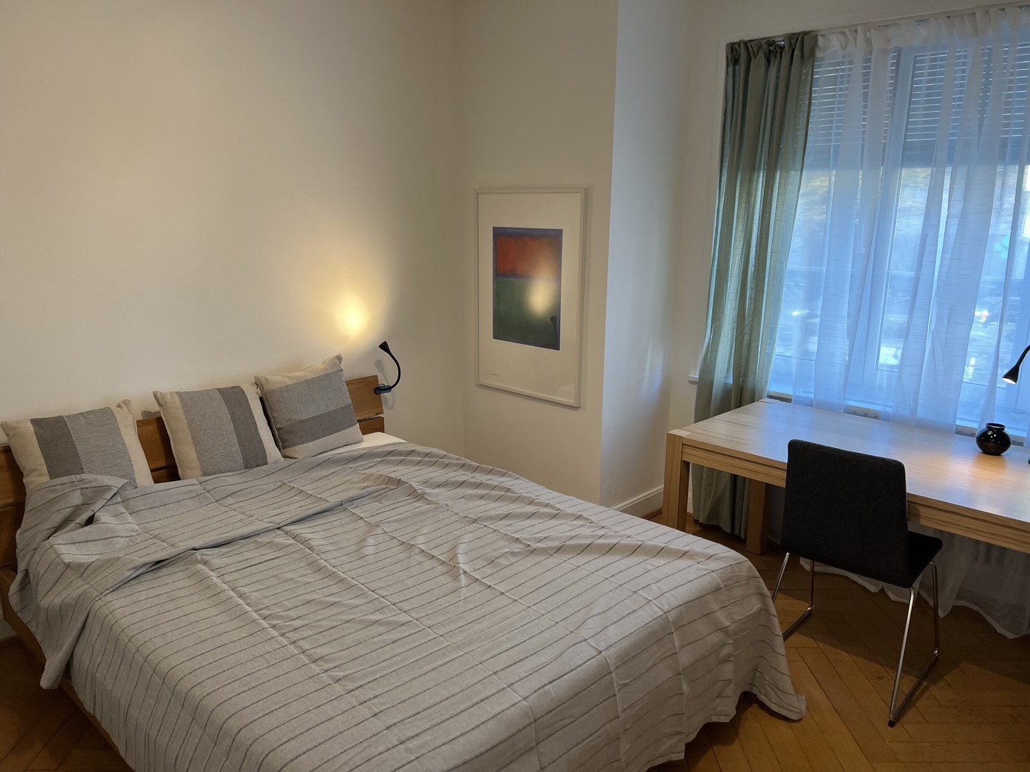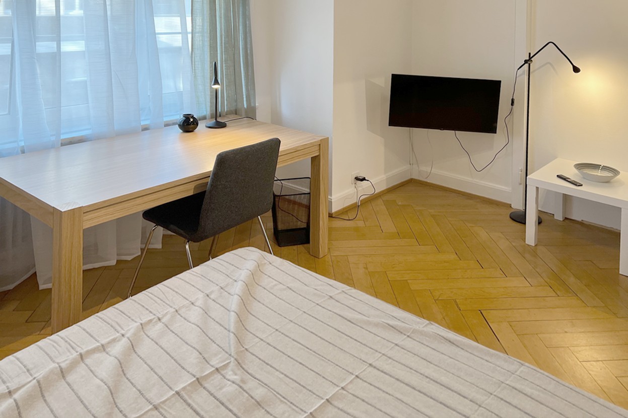 Wir vermieten in sanierten Altbau ein ca. 16 m2 m² grosses, modern möbliertes Nichtraucherzimmer in einer 3er-WG. Das Zimmer ist ausgestattet mit Bett, Nachttisch, Schreibtisch, grossem Kleiderschrank, Sessel und Fernseher und eigenem Balkon zur Privatnutzung. Die moderne Küche, das Bad mit Dusche und WC werden mit zwei Mitbewohnern geteilt. Das Apartment liegt sehr ruhig, nur eine Minute von den Tramlinien 6, Allschwilerplatz, und Nr. 1, Birmannsgasse, entfernt. Mit dem Fahrrad sind es fünf Minuten zur Universität, Bibliothek, Mensa, Biozentrum und Kantonsspital. Zahlreiche Geschäfte, Cafés, Kneipen, Parks und ein Schwimmbad befinden sich in unmittelbarer Nähe. Vorteil: Wir bieten flexible Mietbedingungen, einfache Vertragsabwicklung, Flatrate-Miete, jederzeit kündbar mit 14-tägiger Frist zum Monatsende. In der Miete sind alle Nebenkosten wie Heizung, Wasser, Strom, Waschküche mit Waschmaschine und Trockner enthalten. Wir sind: nette Leute Wir suchen: nette Leute