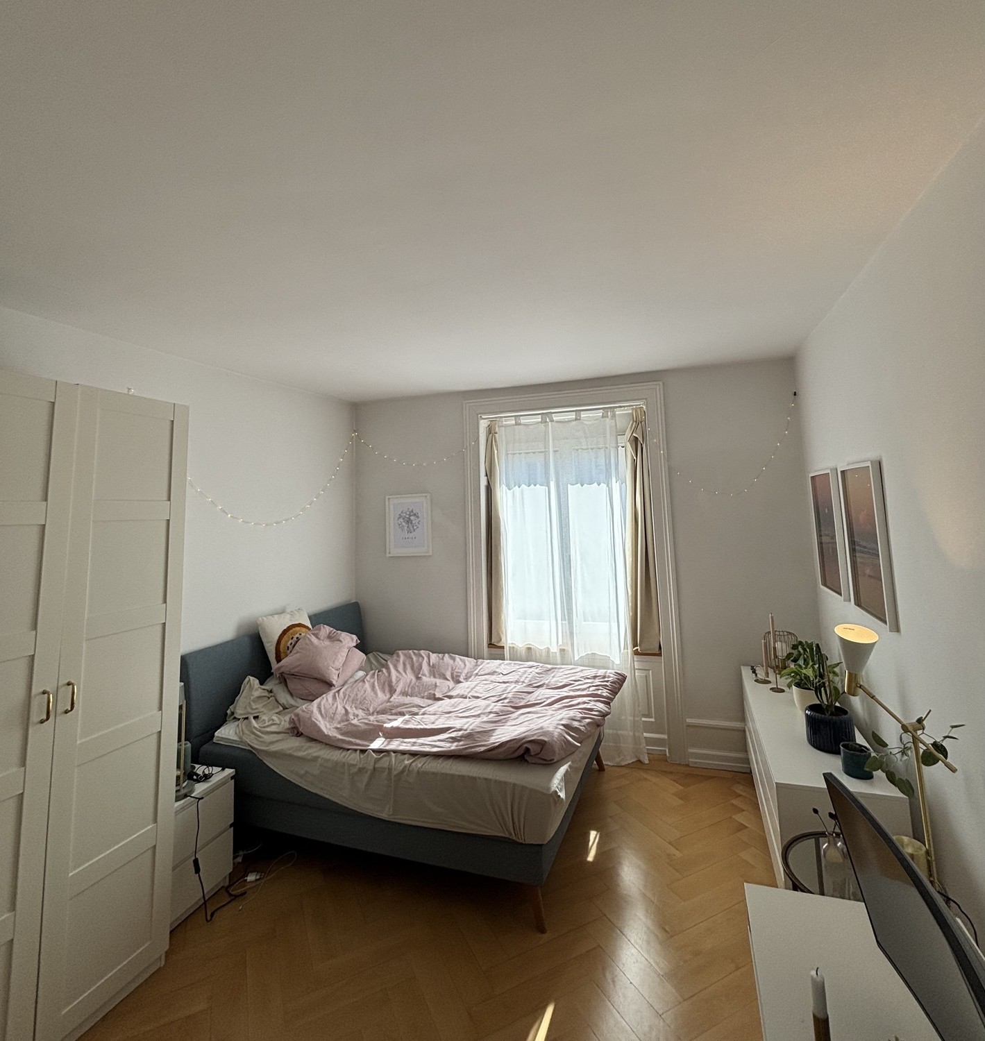 Da ich mit meinem Freund zusammenziehe, wird mein WG-Zimmer ab 01.04.2026 (oder nach Vereinbarung) frei. Es ist eine wunderschöne Altbauwohnung mit grossen Räumen, hohen Decken und schönem Parkett. Sie verfügt über eine separate Küche mit Esstisch, ein gemütliches Wohnzimmer sowie zwei Balkone. Zur Wohnung gehört ausserdem ein geräumiger Keller sowie eine eigene Waschmaschine und ein Tumbler.Sie liegt sehr zentral in der Nähe des Römerhofs. Ein Coop ist nur wenige Gehminuten entfernt, ebenso das 2er und 3er Tram. Deine zukünftigen Mitbewohner sind Schahin (männlich 25) und Fabienne (weiblich 36), beide berufstätig. Die WG-Atmosphäre ist entspannt, ordentlich und unkompliziert, beide sind immer offen zum Reden. In ihrer Freizeit gehen beide gerne Skifahren oder Tennis spielen, sind mit Freunden oder der Familie unterwegs, geniessen auch ab und zu ihr Ruhe (wie fast jeder Mensch : ). Wenn du Interesse hast, melde dich gerne mit ein paar Infos zu dir – wir freuen uns auf deine Nachricht.(Cave: Du musst bereit sein, die geteilte Haptmieterschaft zu übernehmen)