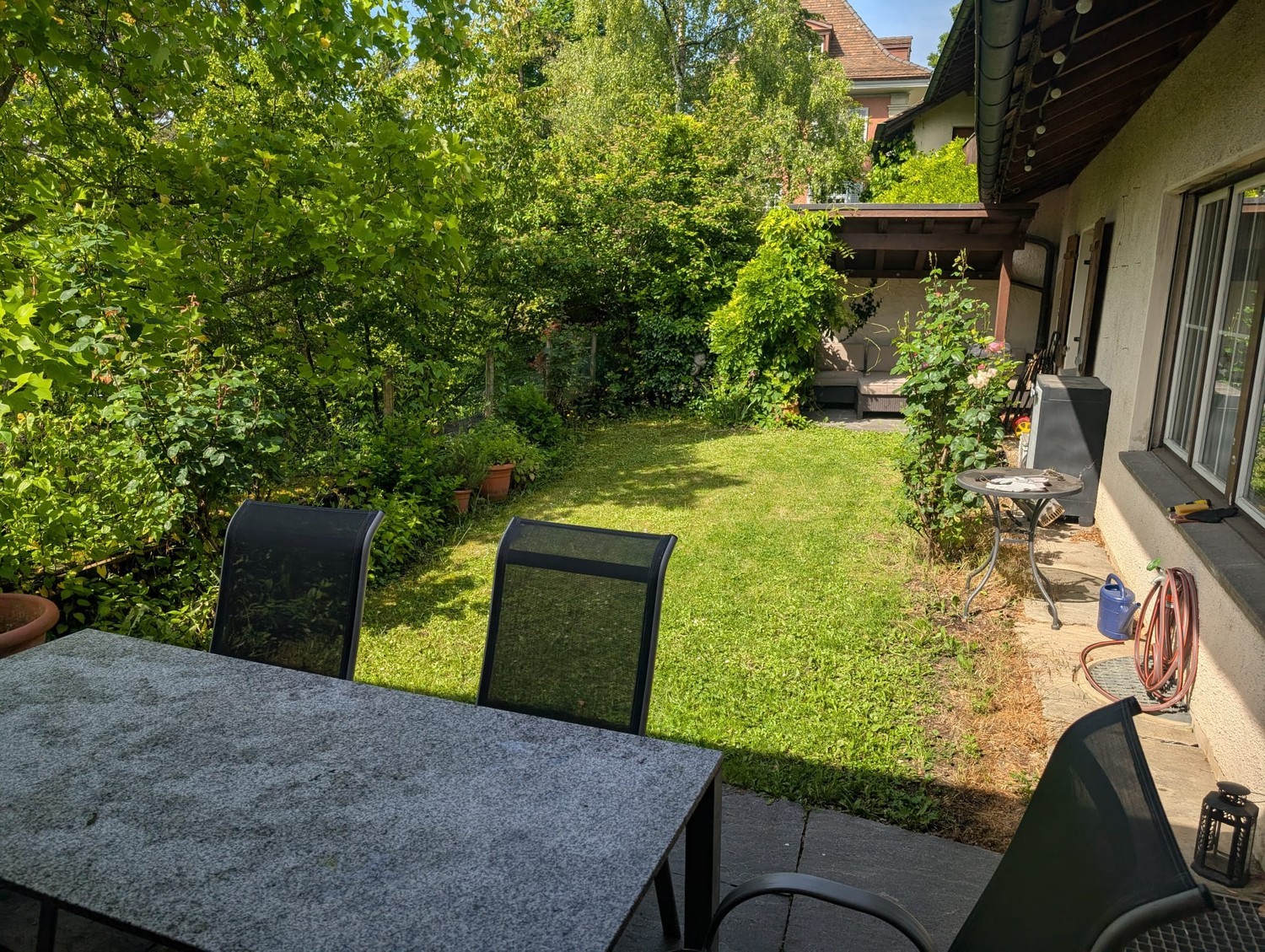 –English below- Wir sind vier ca. 30-Jährige, die zusammen ein dreistöckiges Haus an zentraler Lage (ca. 2 Min. zur Bushaltestelle Lindenplatz, ca. 6. Min. zum Bahnhof / Einkaufsmöglichkeiten) beleben. Wir geniessen es ein bis zweimal in der Woche zusammen zu kochen und den Abend im Sommer auf unserer Gartenterasse ausklingen zu lassen. Wir sind alle berufstätig und geniessen ein respektvolles Miteinander (Ruhe und Sauberkeit mit Freundlichkeit und Gemeinschaft). Zimmer im Haus: EG Hauseingang mit Lift Garage mit AutostellplatzErster Stock Waschraum (Waschmaschine und Trockner) Abstellkeller HeizkellerZweiter Stock 3 Zimmer (eins davon deines) Badezimmer Bügelzimmer AbstellflächeDritter Stock Hauseingang Nummer 2 Badezimmer Schlafzimmer Küche (mit Spülmaschine) Wohnzimmer Dachterrassen (2 Stück und eine davon mit fantastischem Alpenblick) Büro GästezimmerDG Abstellfläche Dein Zimmer ist ca. 8 Quadratmeter gross und verfügt über ein grosses Fenster und einen Einbauschrank. Zusätzlich hast du im Abstellzimmer und Keller Platz um deine Sachen zu verstauen. Das Zimmer ist klein und fein, das Haus jedoch sehr gross. Es ist verfügbar ab 1. Juni oder nach Vereinbarung, das Gästezimmer steht natürlich für eine etwas frühere Ankunft zur Verfügung. Bist du zwischen 25 und 36 Jahre alt und dir ist respektvolles und gemütliches Zusammenleben wichtig? Dann melde dich gerne mit ein paar Zeilen zu Dir und deinen Erwartungen :) Bitte schreibe uns das Wort Osteria mit in die Bewerbung, dass wir sehen können ob du bis hierher alles verstanden hast. Wir freuen uns sehr auf eine schöne gemeinsame Zeit. We are four people in our early 30s who share a three-story house in a central location (about 2 minutes from the Lindenplatz bus stop, about 6 minutes from the train station and shopping areas). We enjoy cooking together once or twice a week and spending summer evenings on our garden terrace. We all work and value respectful shared living (quiet and clean with kindness and community). Rooms in the house: Ground Floor – Main entrance with elevator – Garage with parking space 1st Floor – Laundry room (washer and dryer) – Storage cellar – Boiler room 2nd floor – 3 bedrooms (one of which is yours) – Bathroom – Ironing room – Storage area 3rd floor – Entrance #2 – Bathroom – Bedroom – Kitchen (with dishwasher) – Living room – Rooftop terraces (2, one with a fantastic view of the Alps) – Office – Guest room Top floor – Storage space Your room is approximately 8 square meters and features a large window and a built-in closet. You also have space in the storage room and basement to store your belongings. The room is small but cozy, while the house is very spacious. It is available starting June 1 or by arrangement; the guest room is, of course, available for an earlier arrival. Are you between 25 and 36 years old and do you value respectful and friendly communal living? Then feel free to send us a short message telling us a bit about yourself and your expectations :) Please include the word Osteria in your application so we can see if you've understood everything up to this point. We're looking forward to a wonderful time together.