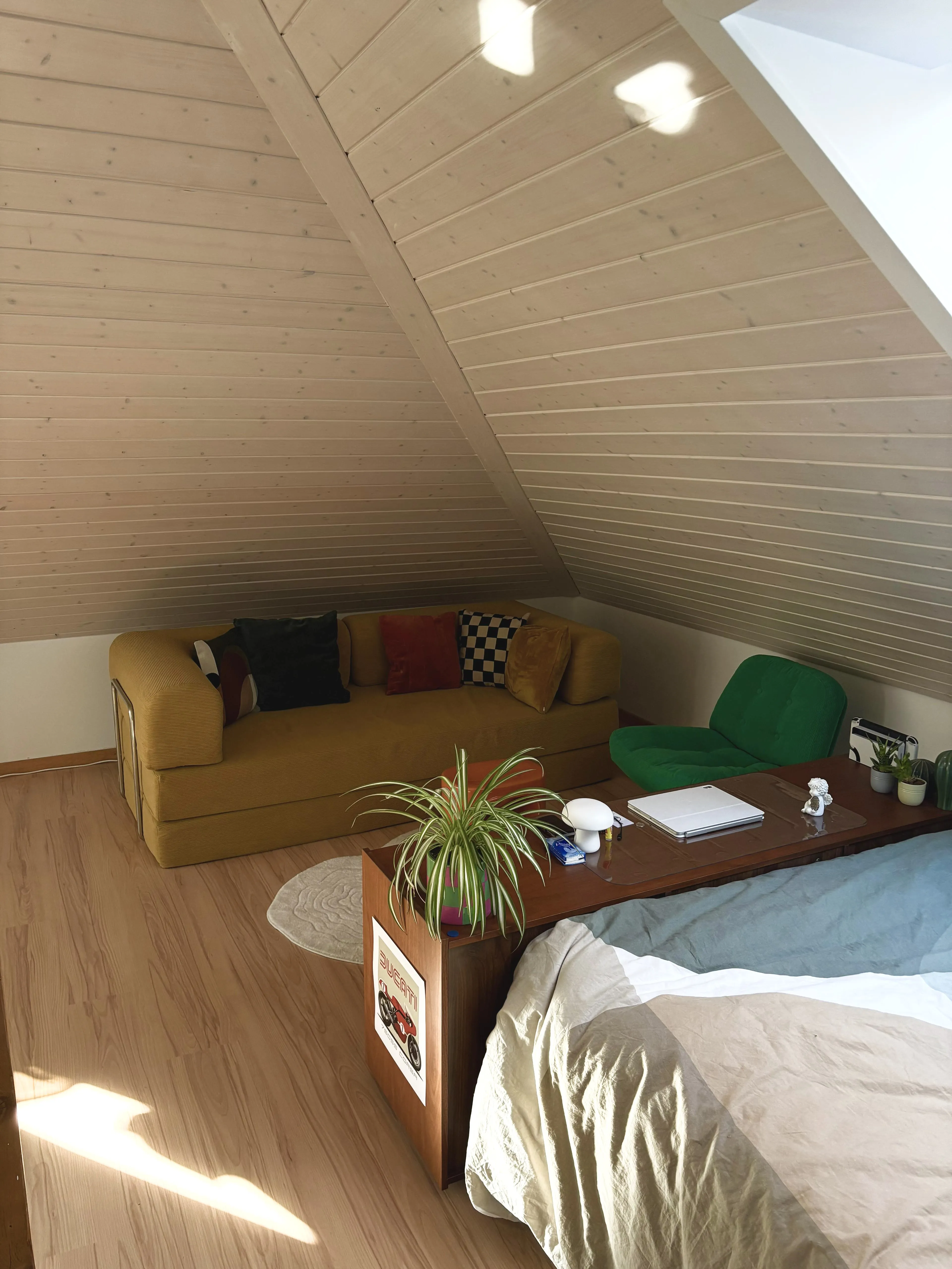 Hallo zusammen :)Ab +- dem 01.04 suchen wir eine Person für unsere dreier WG, welche sich 200 Meter vom Spalentor entfernt befindet. Die Vierzimmer Wohnung an der Missionsstrasse 19a 4055 Basel liegt in einem Innenhof und ist somit ruhig gelegen. Einkaufsmöglichkeiten, ÖV Stationen und Uni Gebäude sind in unter 5min zu Fuss erreichbar.Das frei werdende Zimmer ist 29.8m2 gross (hat wie alle Zimmer Dachschräge) , hat Fenster von zwei Seiten und ist somit angenehm hell. Die Kosten belaufen sich auf 882.- inklusive den NK.Unsere schöne Dachwohnung ist insgesamt 120m2 gross. Das grosse offene Wohnzimmer ist für mich das Highlight der Wohnung und ist ideal für einen geselligen Abend. Die ans Wohnzimmer grenzende Küche ist modern, hat einen Geschirrspüler und viele Schränke. Zudem hat das ziemlich neue Bad eine eigene Waschmaschine. Noé (23, Männlich) ist in Biel aufgewachsen und lebt seit drei Jahren in Basel. Er studiert Teilzeit Jura und macht dazu Leistungssport in der Sportart Kanu Slalom. Zudem schaut er gerne Eishockey (vor allem Spiele des EHC Biels) und isst sehr gerne und kocht daher auch :)Pierino (27, Männlich) kommt aus der Region und wohnt seit einem Jahr in der WG. Er hat den Sport Master und beendet bald noch den Wirtschafts Master. Er spielt und schaut gerne Fussball und ist viel im Uni Gym, wo er auch arbeitet.Wir heissen zwar beide Anderegg, jedoch sind wir soweit wir wissen nicht verwandt. Wir sind beide durch die Uni und dem Leben neben dran ziemlich beschäftigt. Wenn wir aber beide zu Hause sind und Zeit haben essen und unterhalten wir uns gerne oder machen auch mal etwas zusammen. Wenns passt freuen wir uns also gemeinsam Zeit zu verbringen, aber wir sind auch sehr verständnisvoll, wenn man mal keine Zeit hatWir freuen uns von dir zu hören Noé und Pierino